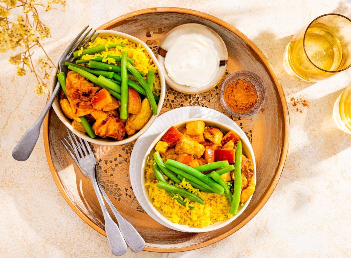 Verdeel de rijst, kip madras en sperziebonen over de borden en serveer.