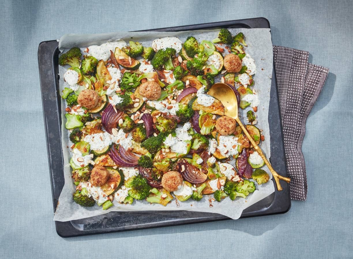 Traybake met kipballetjes, broccoli, courgette en muntsaus