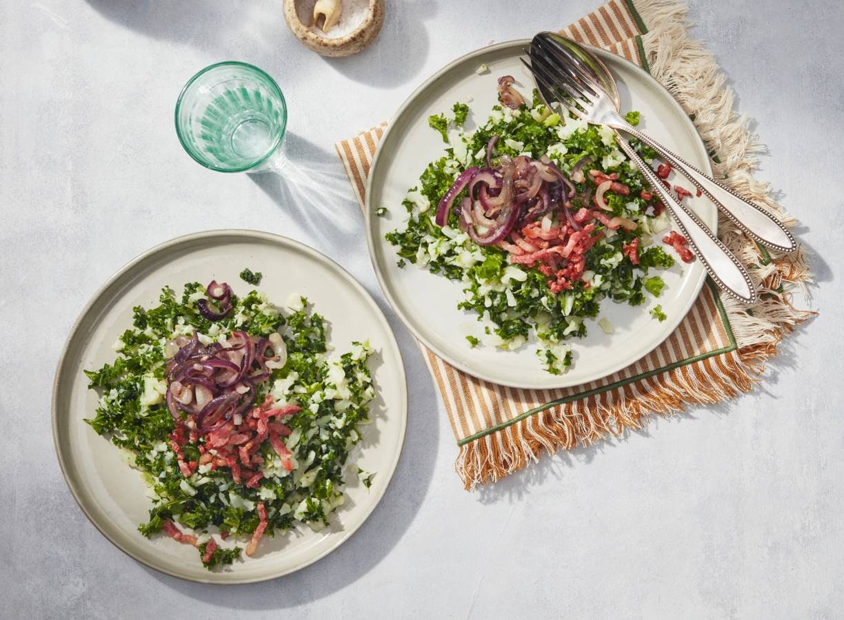Boerenkoolstamppot van bloemkool met gebakken spek