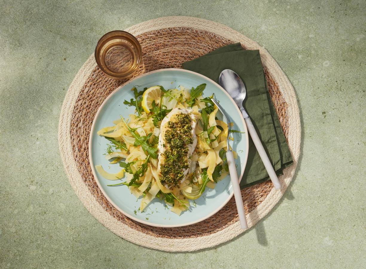 Kip met notenkorst uit de oven en koolraaptagliatelle
