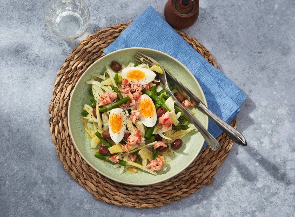 Venkelsalade met sperziebonen, olijven, zalm en ei