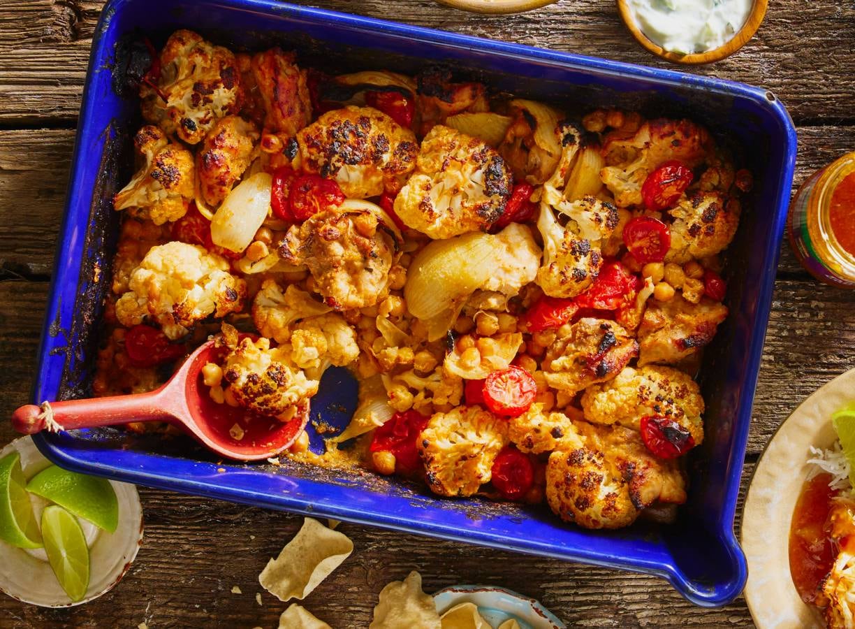 Koken met Patak's: deze traybake maak je met kikkererwten, kip en bloemkool. Meng ze met korma-kruidenpasta en serveer met rijst, pappadums en zelfgemaakte yoghurtdip. Yum!