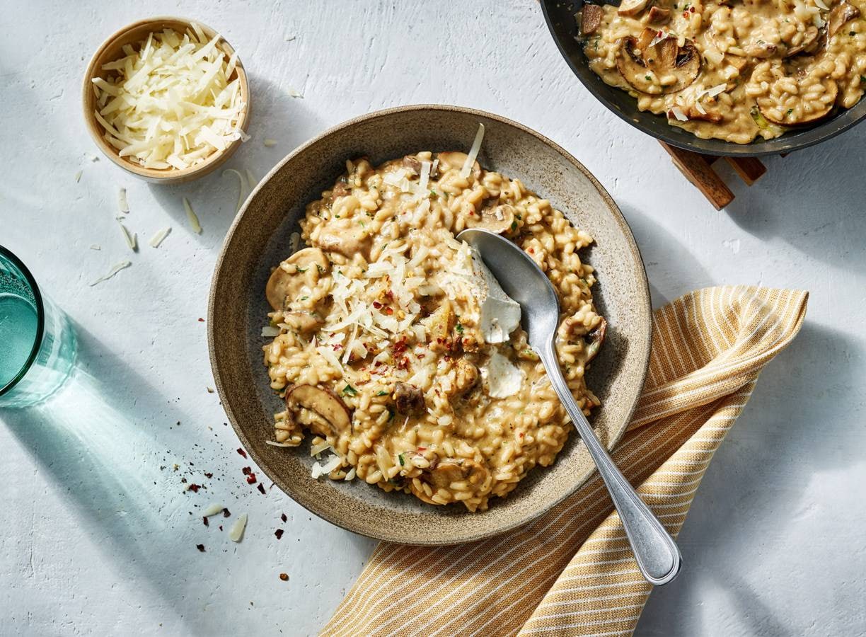 Serveer de paddenstoelenrisotto in diepe (voorverwarmde) borden en garneer met de rest van de kaas.