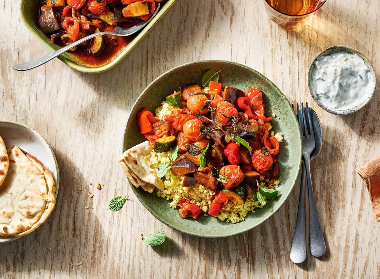 Serveer de couscous op borden en schep er de groentestoof en gepofte cherrytomaten bij.