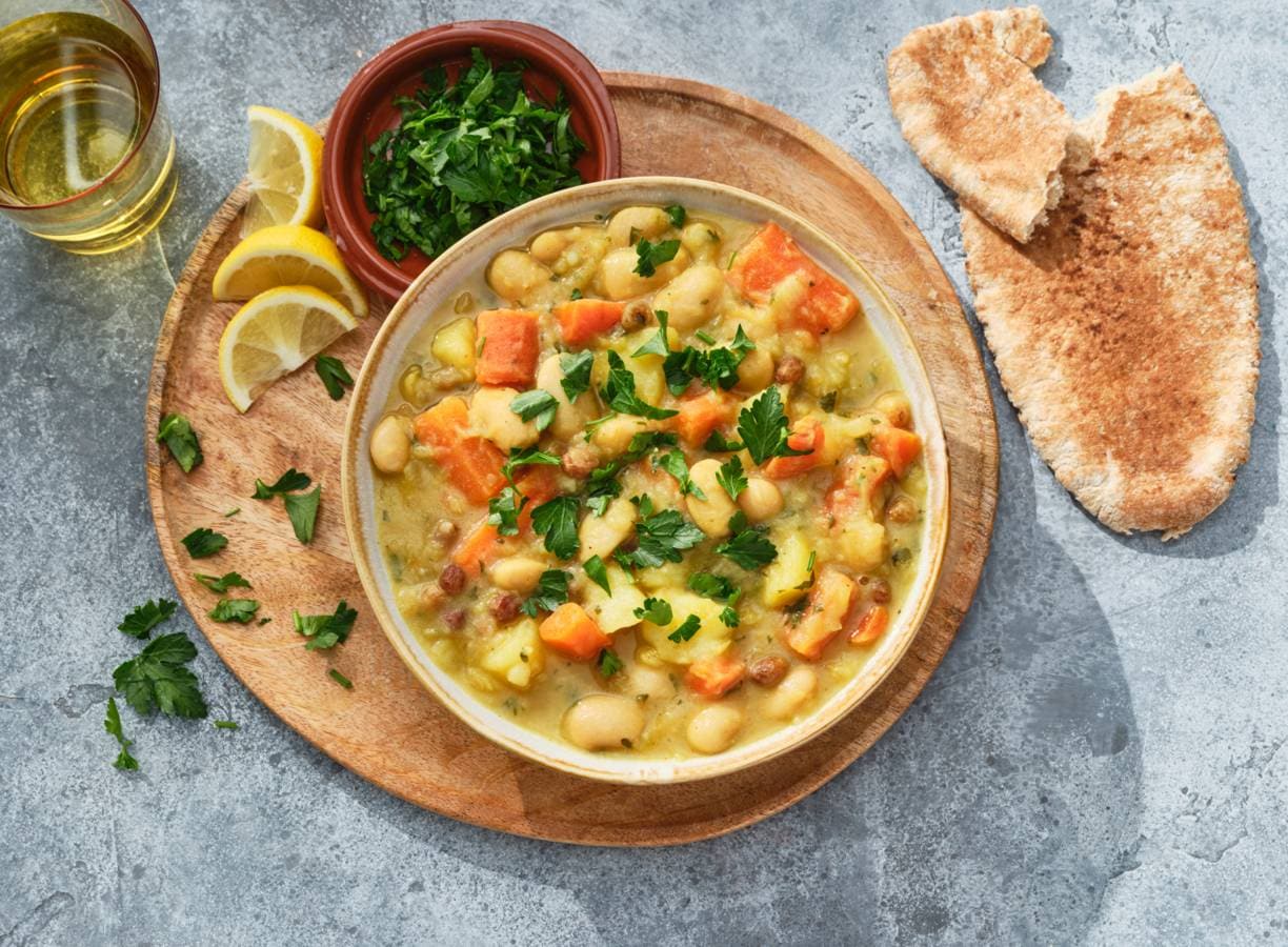 4. Snijd de peterselie fijn. Schep de bonen met het vocht, de rozijnen en peterselie de laatste 5 min. door de aardappel en wortelstoof.