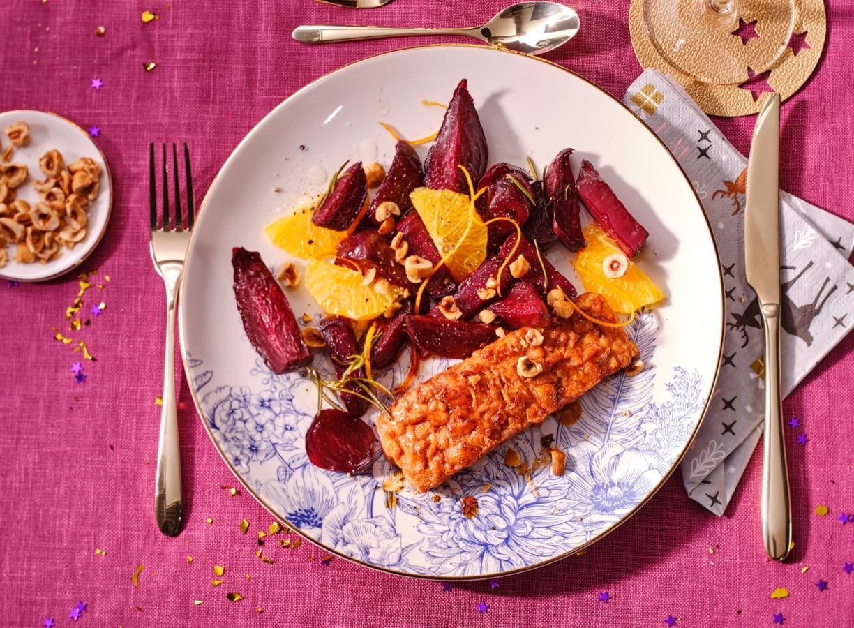 Een kleurrijk kersthoofdgerecht zónder vis of vlees? Deze plantaardige zalmfilet met ketjapglaze kleed je extra feestelijk aan met een salade van geroosterde bieten, sinaasappel en een fruitige dressing.