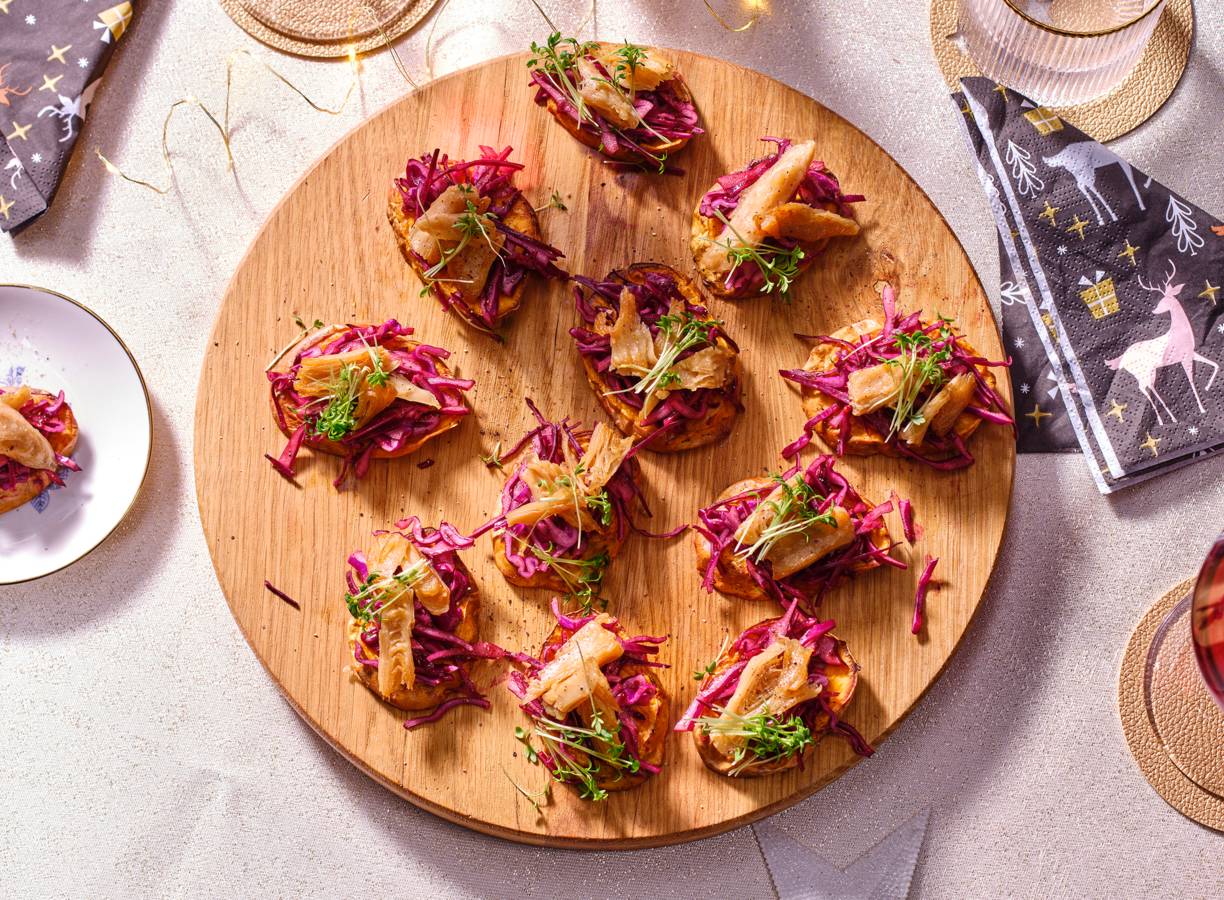 Maak de borrel compleet met dit borrelhapje van zoete-aardappel met rodekooolsalade en vega kipstukjes. Een kleurrijk hapje waar je niet alleen vegans blij mee maakt.
