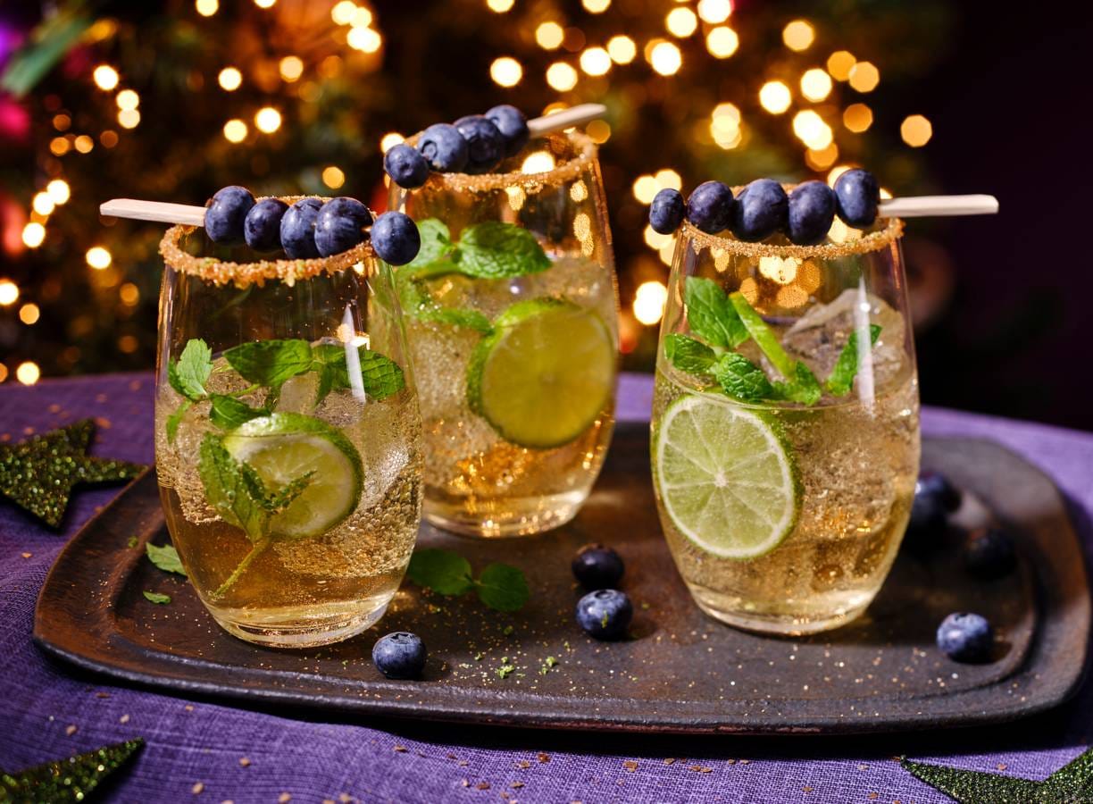 Maak dit verfrissende mocktailrecept en kleed het glas feestelijk aan met een randje limoensuiker, frisse munt en een prikkertje vol zoete blauwe bessen. Het ideale aperitief voor je kerstdiner!