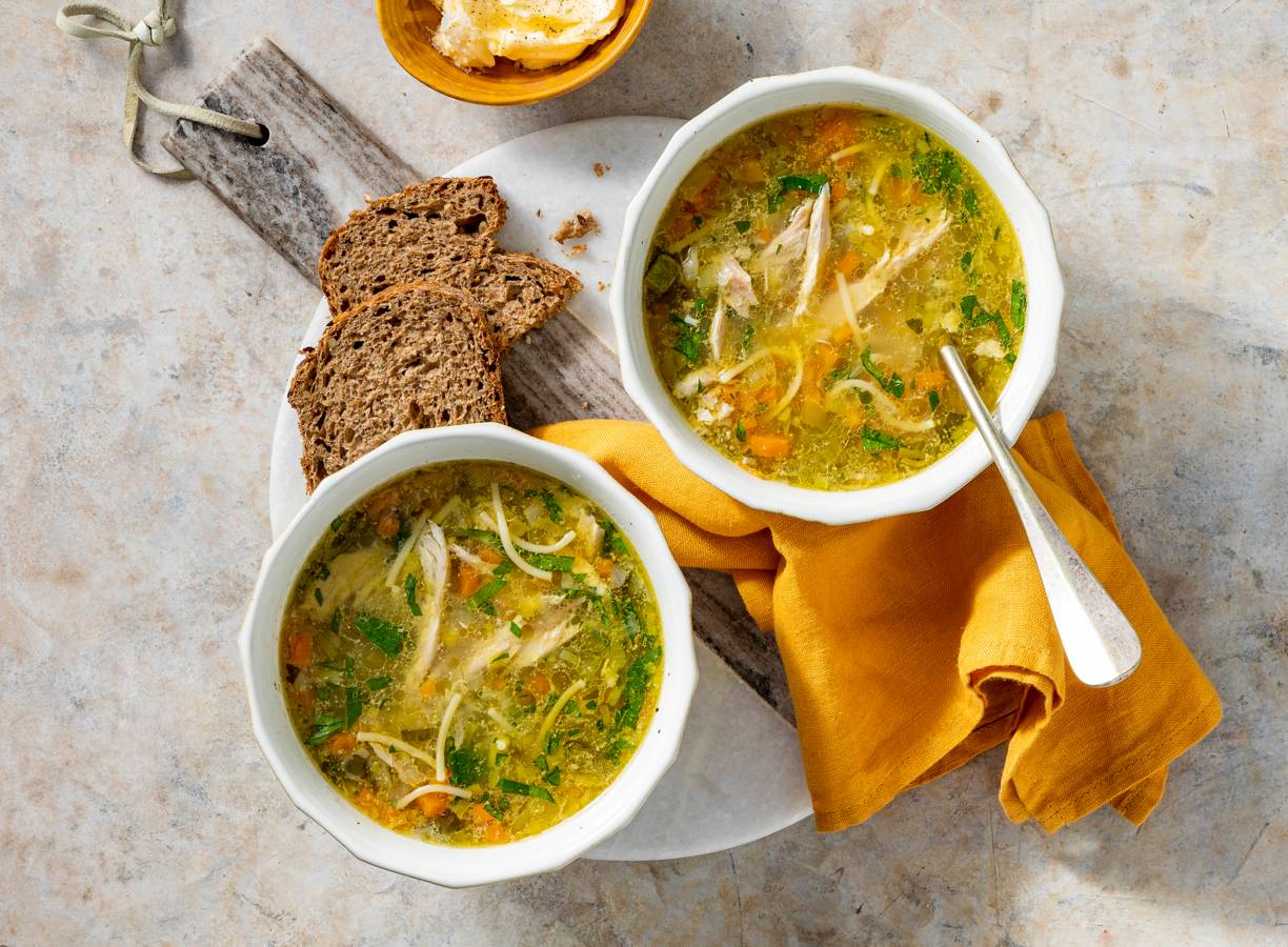 Oma's kippensoep is altijd een goed idee. Maak het met prei, vermicelli en bleekselderij. Extra smaakvol met laurier en foelie.