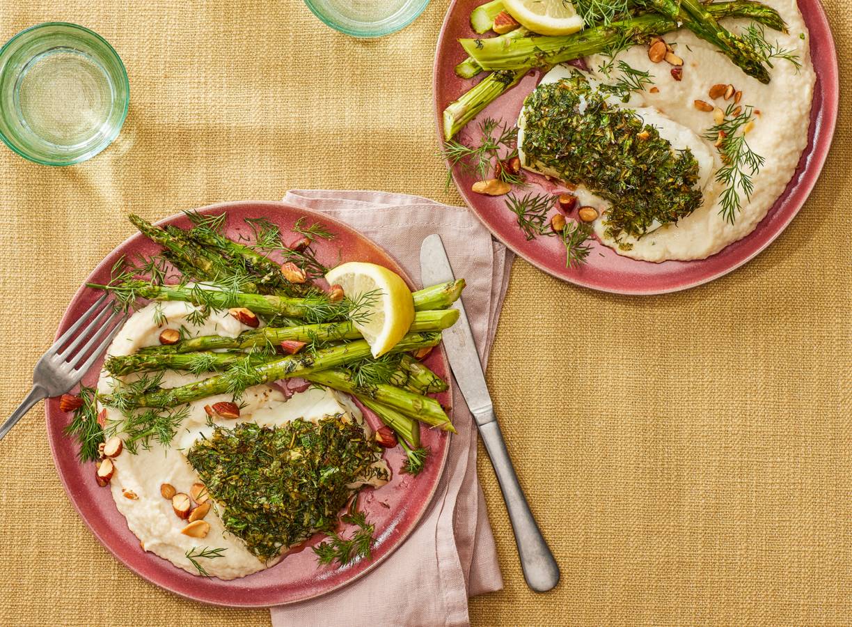 Verdeel de puree over platte borden en verdeel de groene asperges, kabeljauw en citroenpartjes erover. Hak de amandelen grof en bestrooi samen met de rest van de dille erover.
