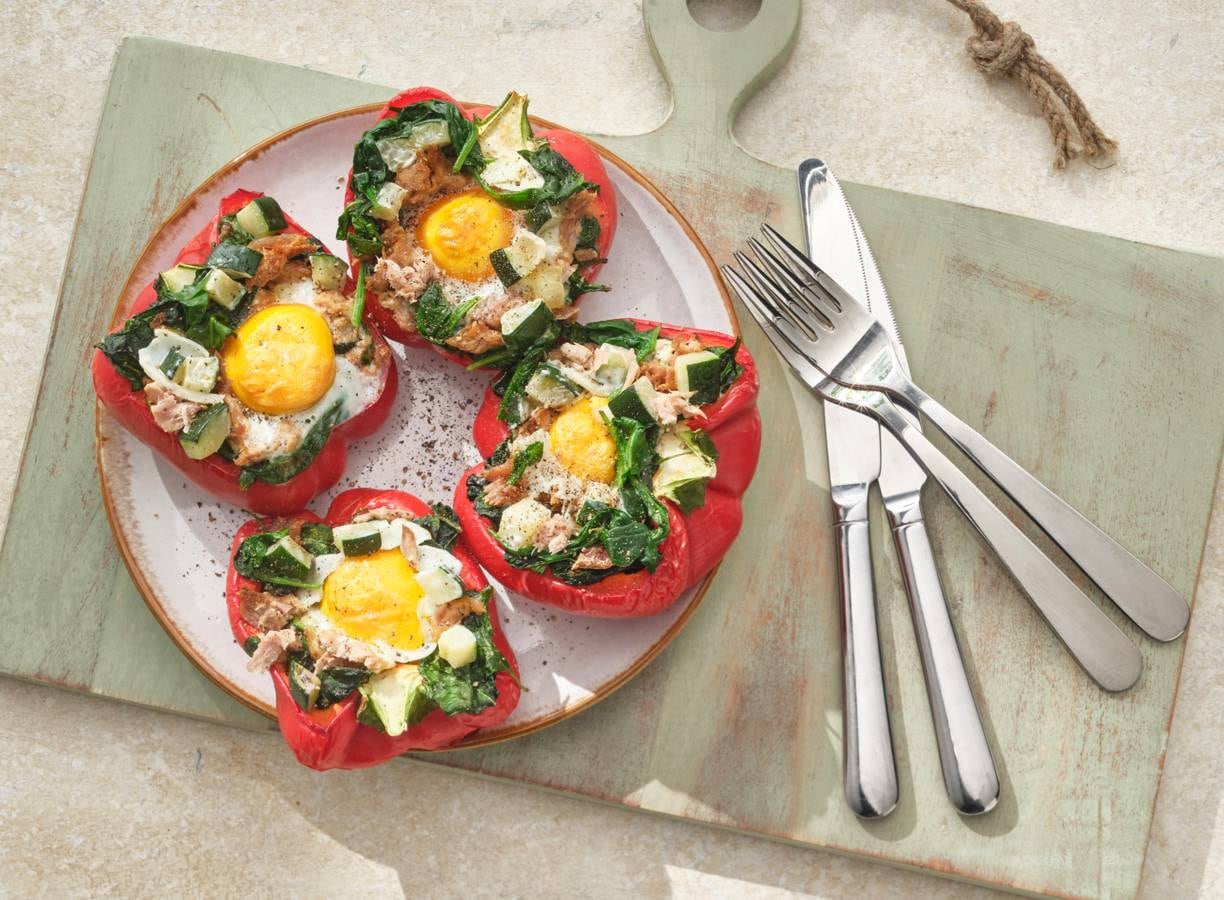 Gevulde paprika's spinazie, tonijn en ei