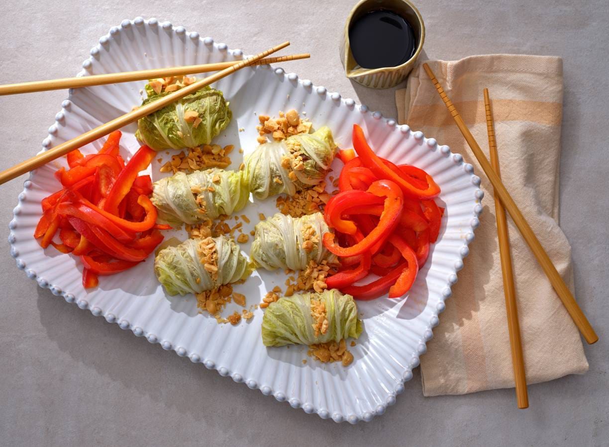 Vul deze koolrolletjes met gehakt, taugé en gebakken paprika. Kleurrijk op je bord en ook nog eens keto. Met de smaak van sojasaus en gember is het helemaal af.