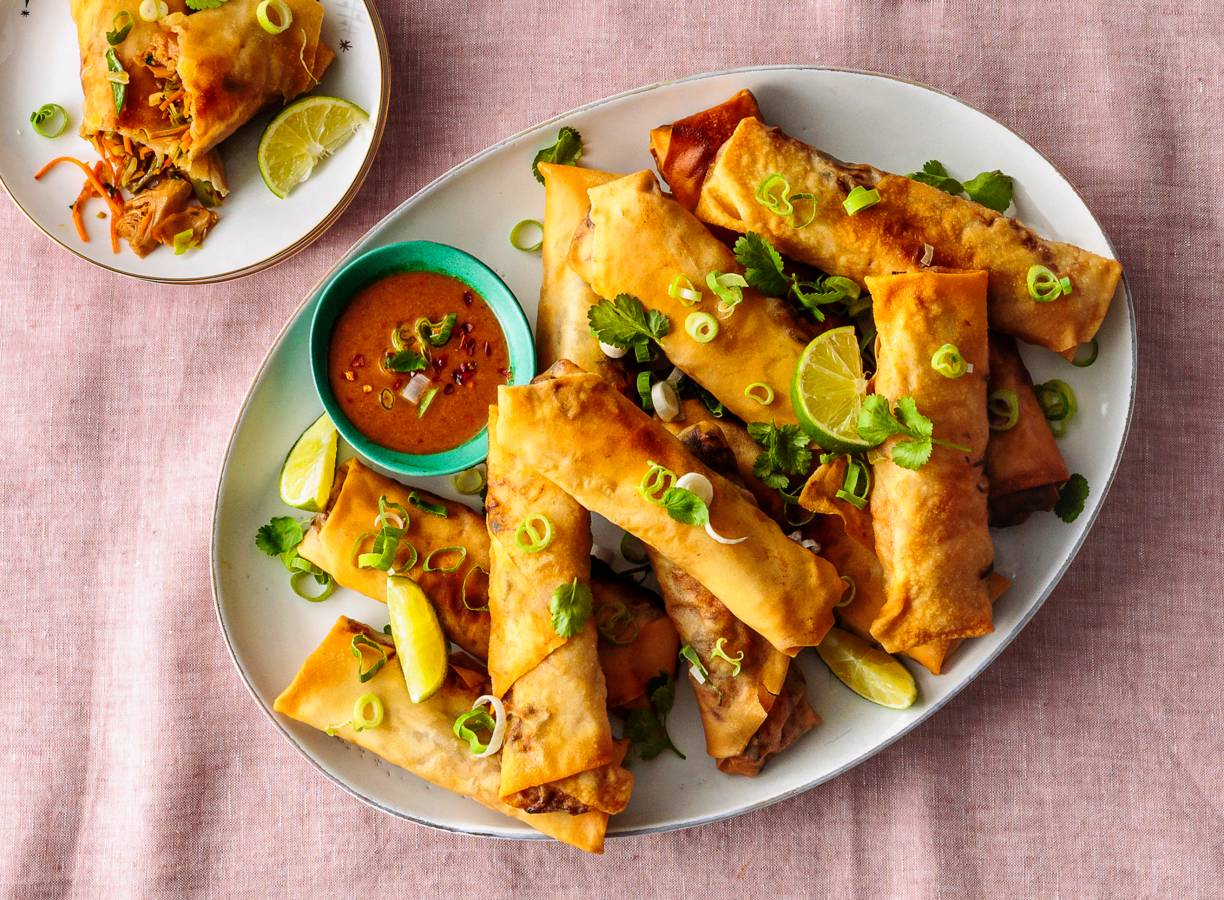 Bak de loempia’s in 5-6 min. in de hete olie gaar en knapperig. Bak er niet te veel tegelijk, want dan plakken ze aan elkaar. Laat tussendoor de olie op temperatuur komen. Serveer met de pindasaus en garneer met de rest van de bosui en koriander en de limoenpartjes.