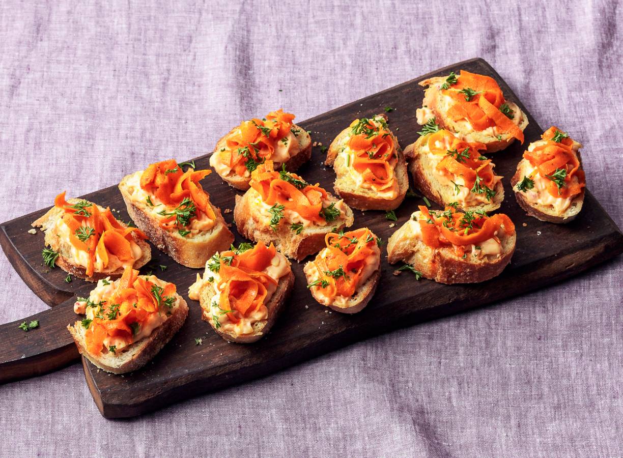 Oude kaas, zoete chili en wortel met een friszoete dressing: deze bruschetta laat je smaakpapillen dansen.