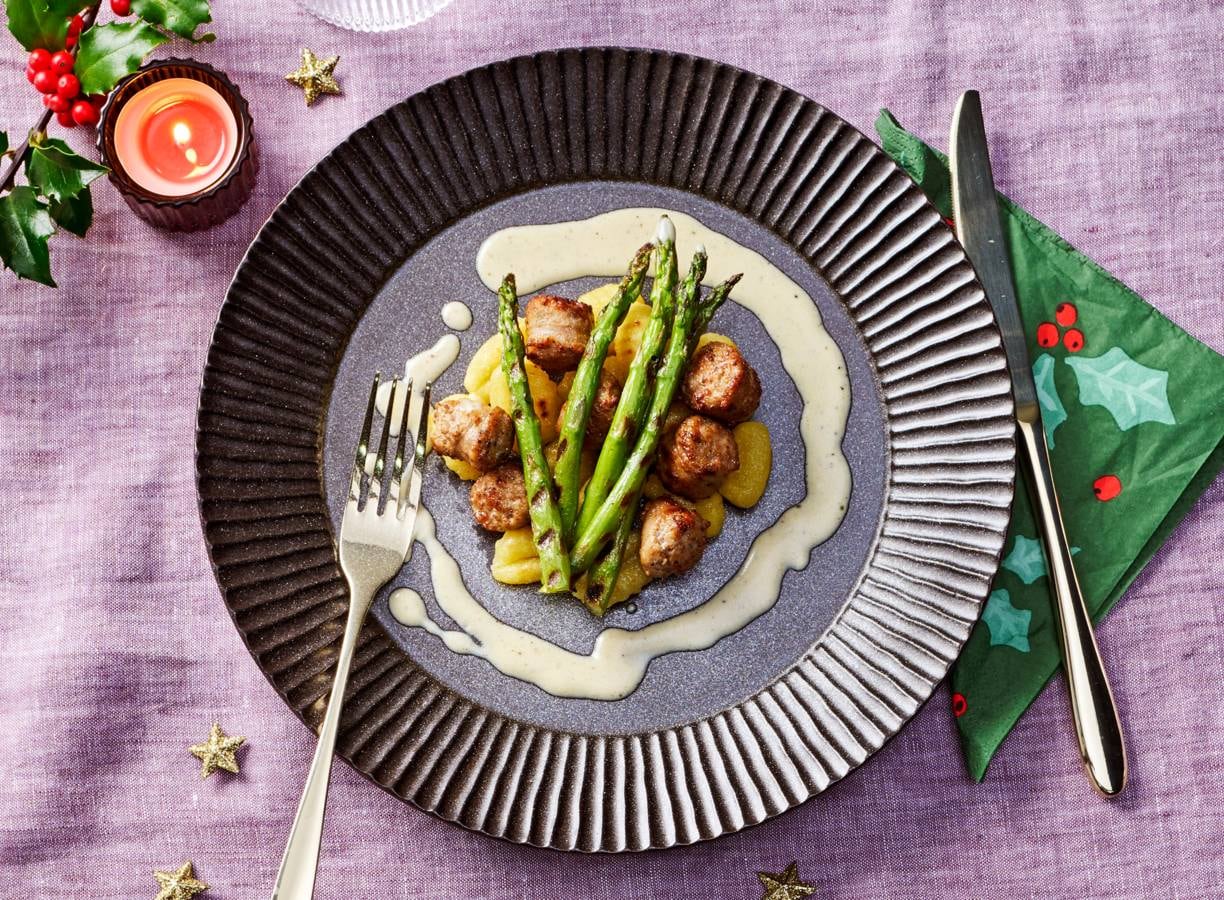 Het krokante van de aspergetips, het zachte van de gnocchi en het hartige van de worst. Dat is pas een spectaculair kerstgerecht. En nog snel ook!