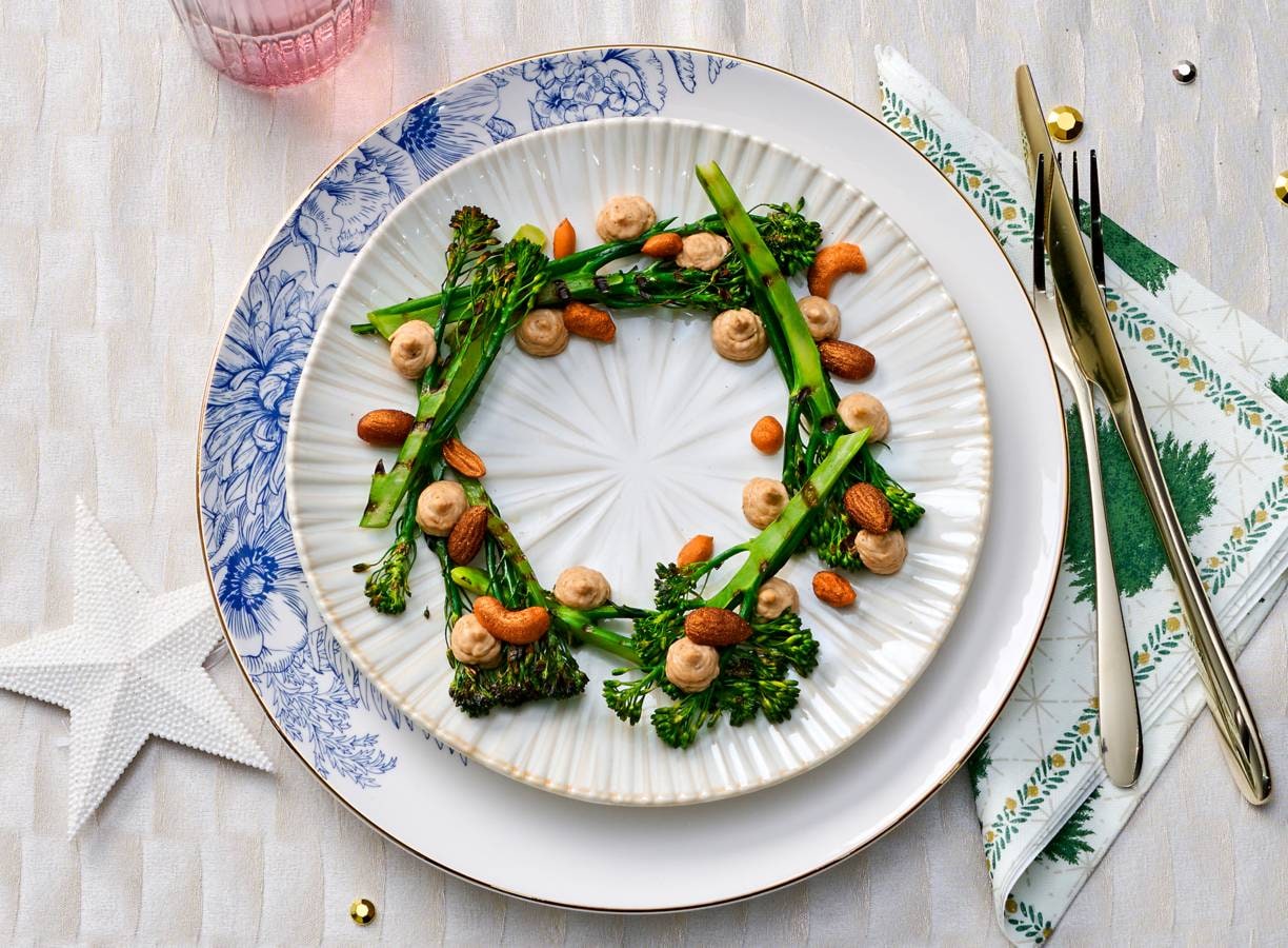 Verdeel de bimi in een krans over de borden en verdeel dotjes ansjovispistachecrème erover. Spuit de rest van de noten goud en verdeel over de kransen.