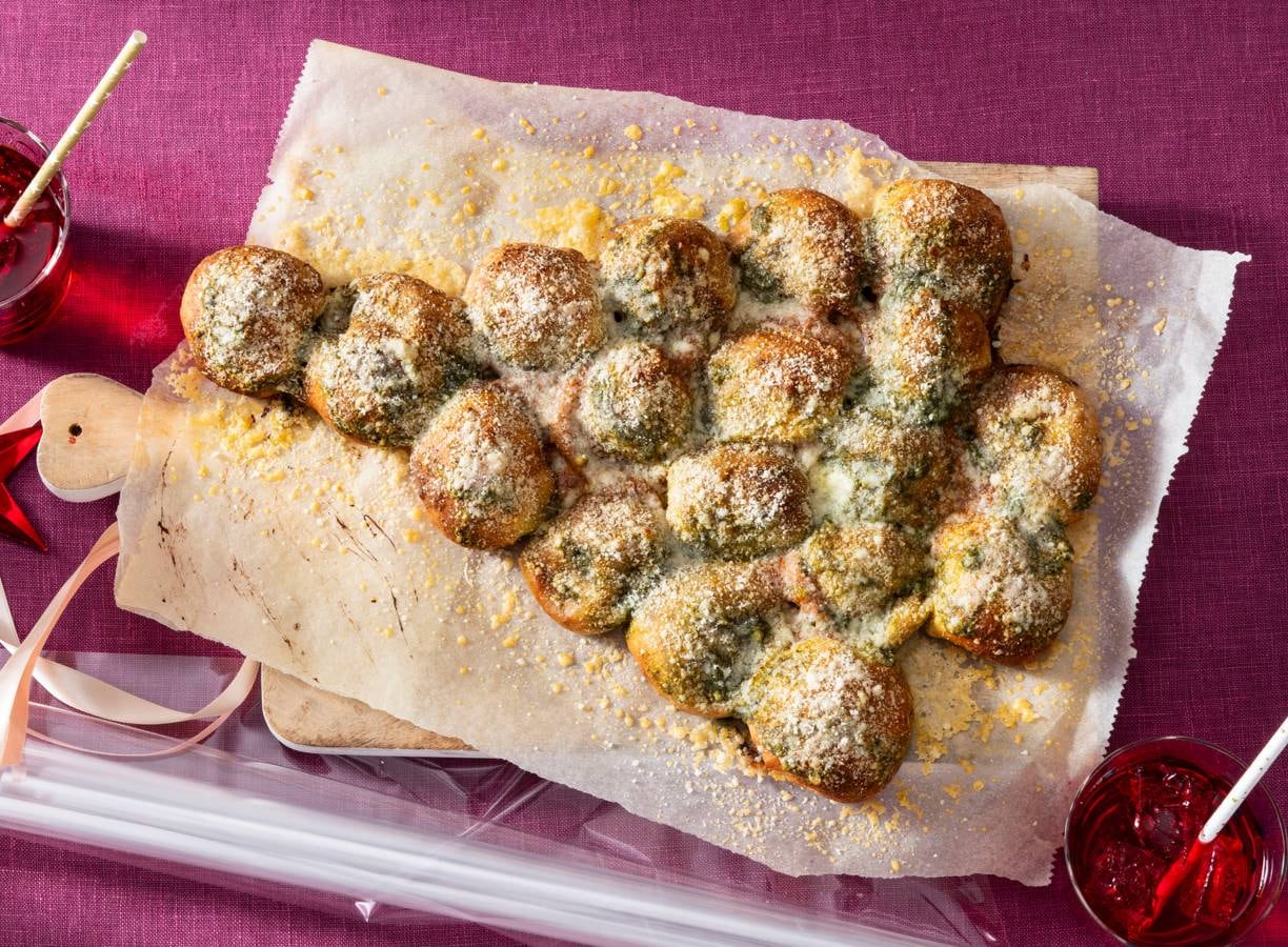 Leg de bolletjes met de randen naar beneden in de vorm van een kerstboom op een met bakpapier beklede bakplaat. Leg van boven naar beneden 1, 1, 2, 3, 4, 5 en 2 bolletjes. Bak ca. 20 min. in de oven. Haal uit de oven, bestrijk met de rest van de pesto en bestrooi met de Parmigianopoeder. Bak nog ca. 5 min.