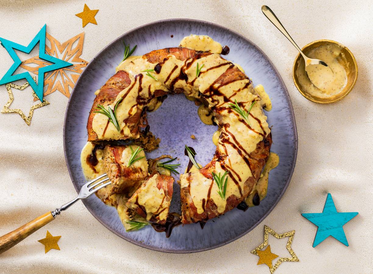 Gehaktbroodkrans met spek en mosterdsaus