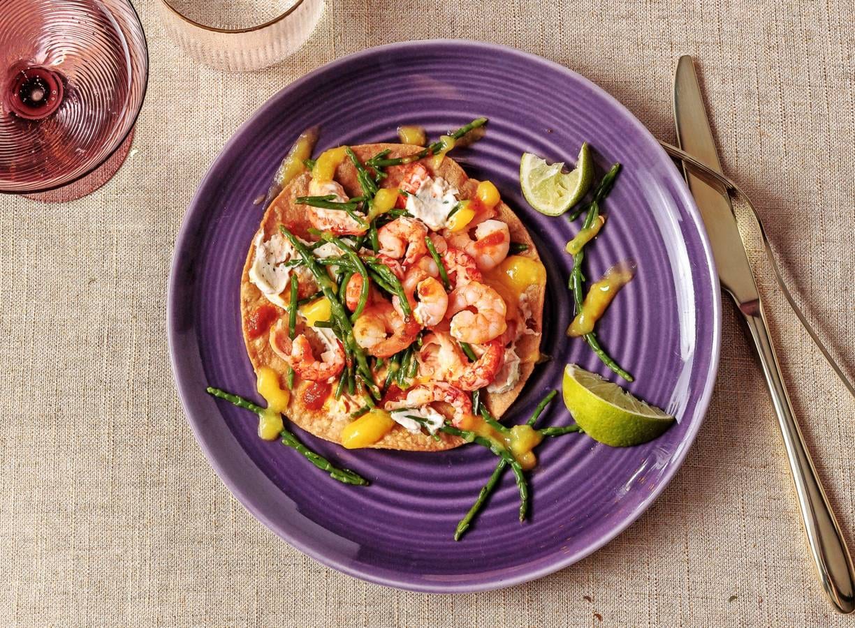Droom weg naar de zee met deze tostada met garnalen, rivierkreeftjes en zeekraal. Lekker met de frisse mango en maistortilla's.