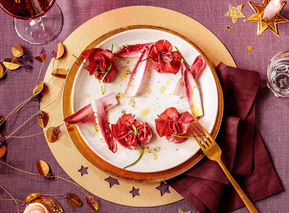 Verdeel het roodlof over de borden en leg de buideltjes verspreid over elk bord.