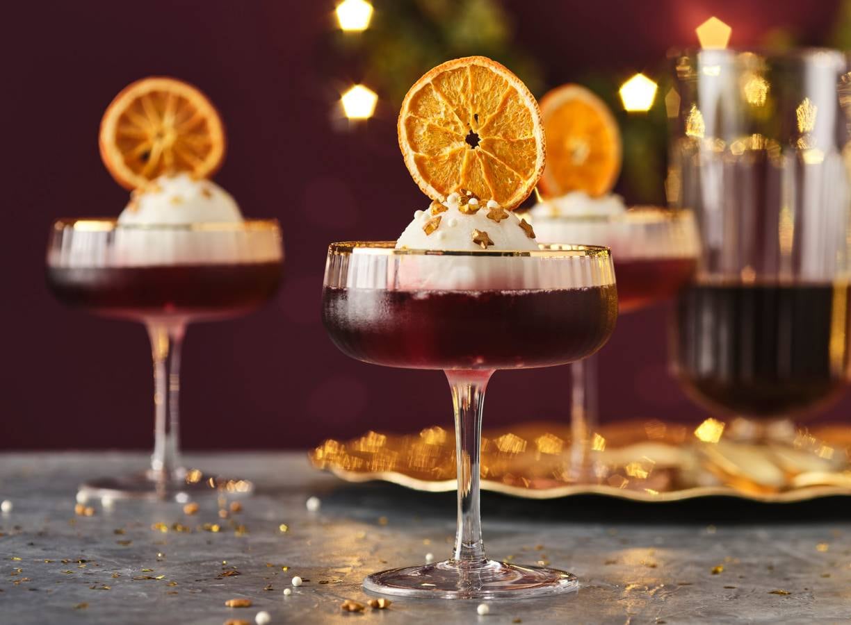 Champagnesorbetijs in je glühwein? Ja zeker! Afgetopt met gouden sterrenmix en gedroogde sinaasappelschijfjes is dit hét drankje van de avond.