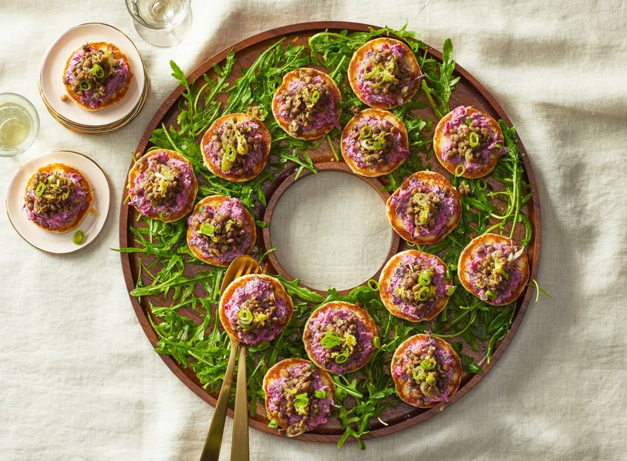 Winterse ‘tzatziki’ met biet in plaats van komkommer. Verrassend met het frisse van citroen. Deze blini-krans met rode bietjes en linzensalade heeft een echt wauw-effect!
