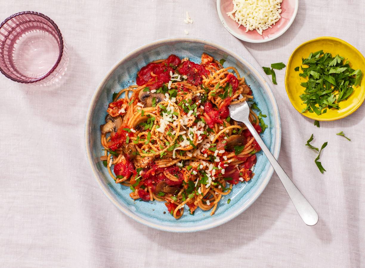 Simpel maar oh, zo lekker. Deze half volkorenpasta in tomatensaus met kipdijfilet en champignons staat ook nog eens in maar 25 min. op tafel.