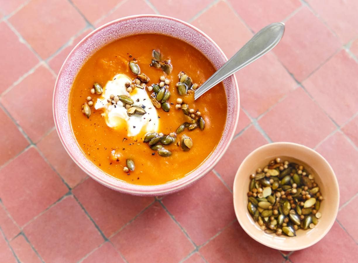 Deze gezonde zoete-aardappelsoep zit boordevol groenten en heeft een frisse touch van sinaasappel. Lekker met wat geitenkaas en zelfgemaakte specerijenolie.