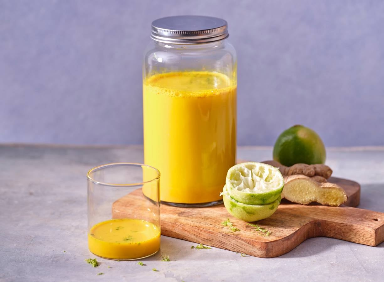 Gooi verse gember, kurkuma en limoen in de blender voor een zelfgemaakte gembershot! Je kan deze een week bewaren in de koelkast en elke dag goed beginnen met een shot vitamines.