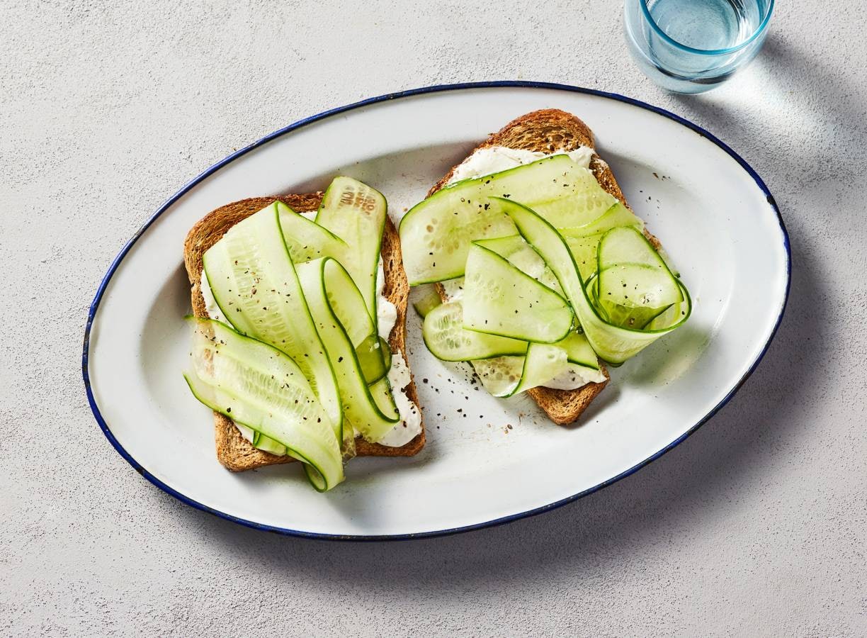 Geroosterd brood + zuivelspread en komkommer. Zo makkelijk (en lekker) kan een snel gezond ontbijt zijn.