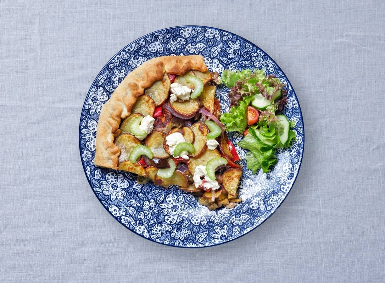 Schep de gebakken groente op de crème fraîche, verdeel hierover de rauwe rode ui en leg de aardappelschijfjes dakpansgewijs hierop. Smeer de aardappelschijfjes licht in met de rest van de olie en vouw de randen van het deeg over de groente. Bak de taart 30-40 min. in de oven.