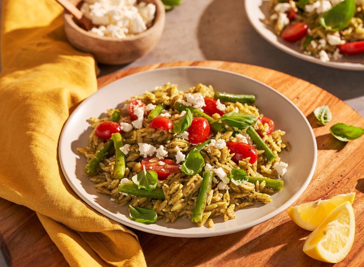 Koken met Grand’Italia: Geef jouw pasta pesto een twist met Orzo Tradizionali. Dit kleine pastavormpje is heerlijk in combinatie met Pesto alla Genovese en lekker veel groente!