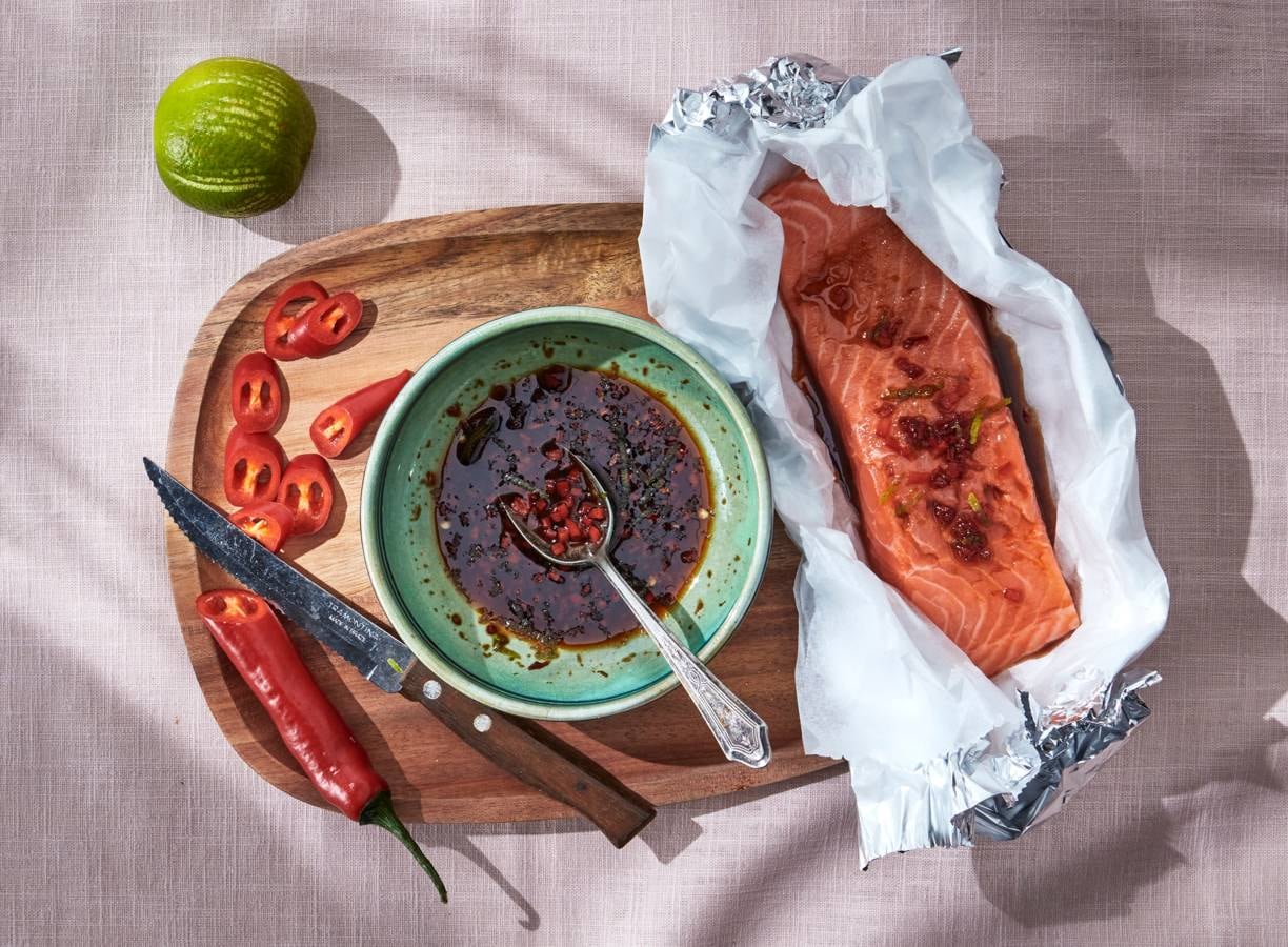 bereidingstip:Haal de zalm uit de marinade, verpak individueel losjes in bakpapier. Voeg 1 el water per pakketje toe en vouw de pakketjes losjes maar goed dicht, zodat er geen stoom kan ontsnappen. Leg op een bakplaat en bak 20-25 min. in de oven op 180 °C. Kook de rest van de marinade in een steelpan op laag vuur in tot een dikke saus. Lekker met rijst en gewokte groente. Snijd de limoen in partjes en serveer erbij.