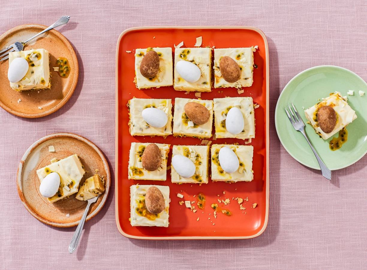 Schaaf ondertussen met de dunschiller krullen van de chocolade. Snijd de taart in 16 gelijke stukjes. Verdeel de rest van de passievrucht en dragee-eitjes over de taartjes en bestrooi met de chocoladekrullen.