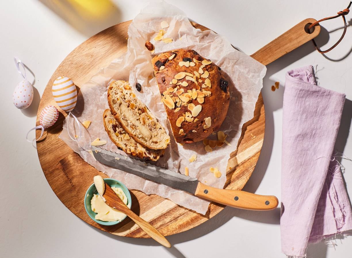 7. Smelt ondertussen de rest van de boter. Bestrijk na 15 min. de stol met de gesmolten boter, bestrooi met het amandelschaafsel en bak nog ca. 10 min. op 160 °C. Het brood is gaar als het hol klinkt als je erop tikt. Laat 30 min. afkoelen.