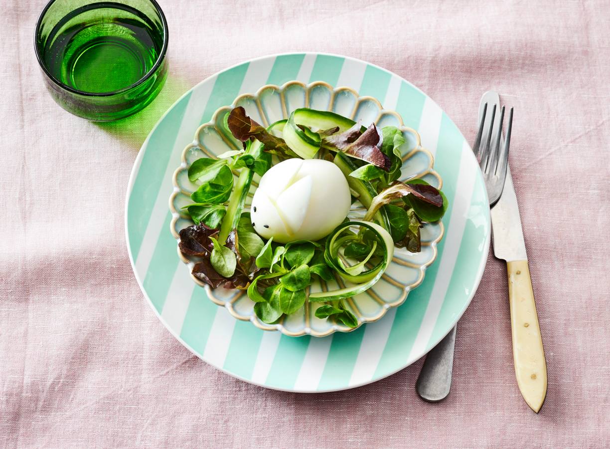 Verdeel de sla over een serveerschaal en leg de komkommerlinten er in sierlijke krullen op. Verdeel de haasjes erover.