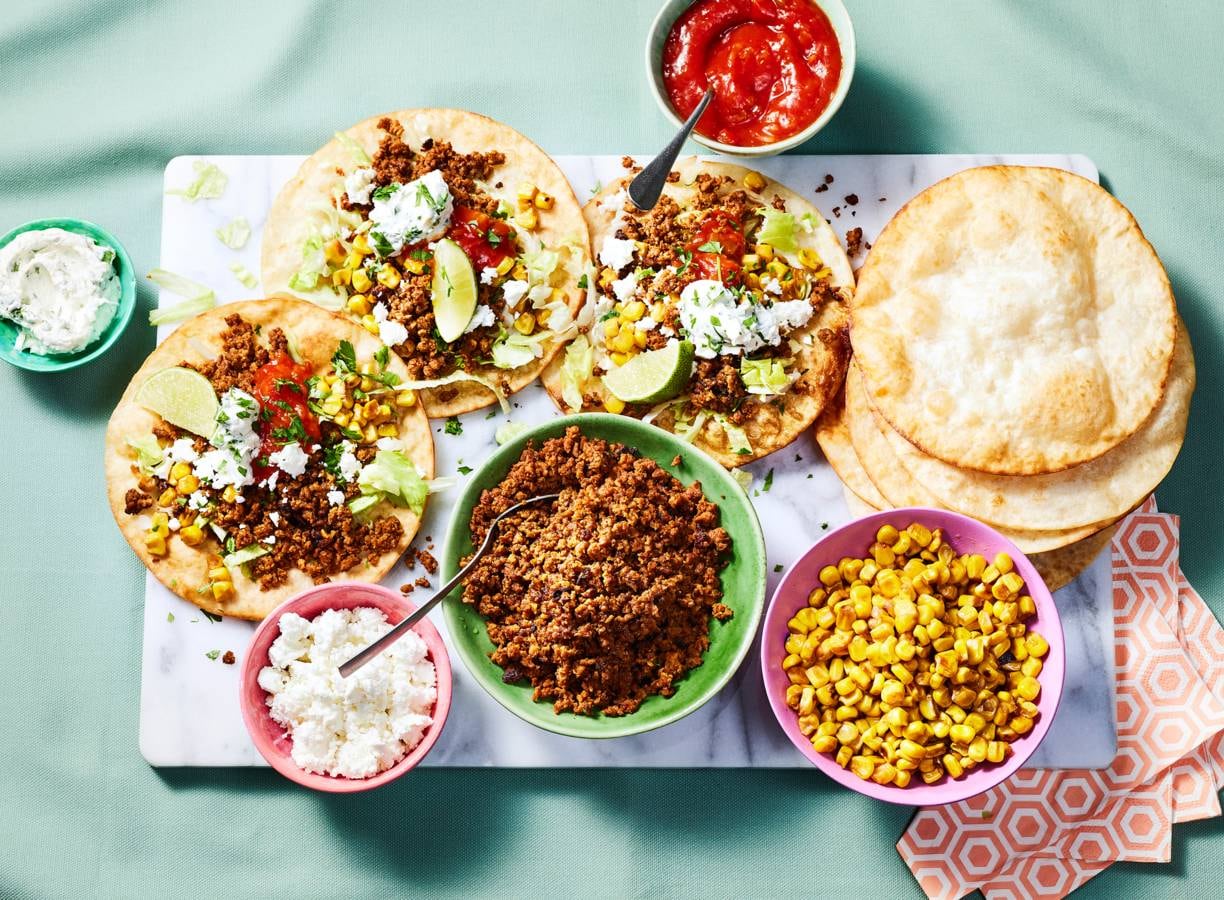 Verkruimel ondertussen de feta. Verdeel het rulgehakt, de mais, feta, ijsbergsla, limoen-peterseliespread, salsa en limoenpartjes over aparte kommen. Serveer met de tostada’s, zodat iedereen zijn eigen tostada’s kan beleggen.