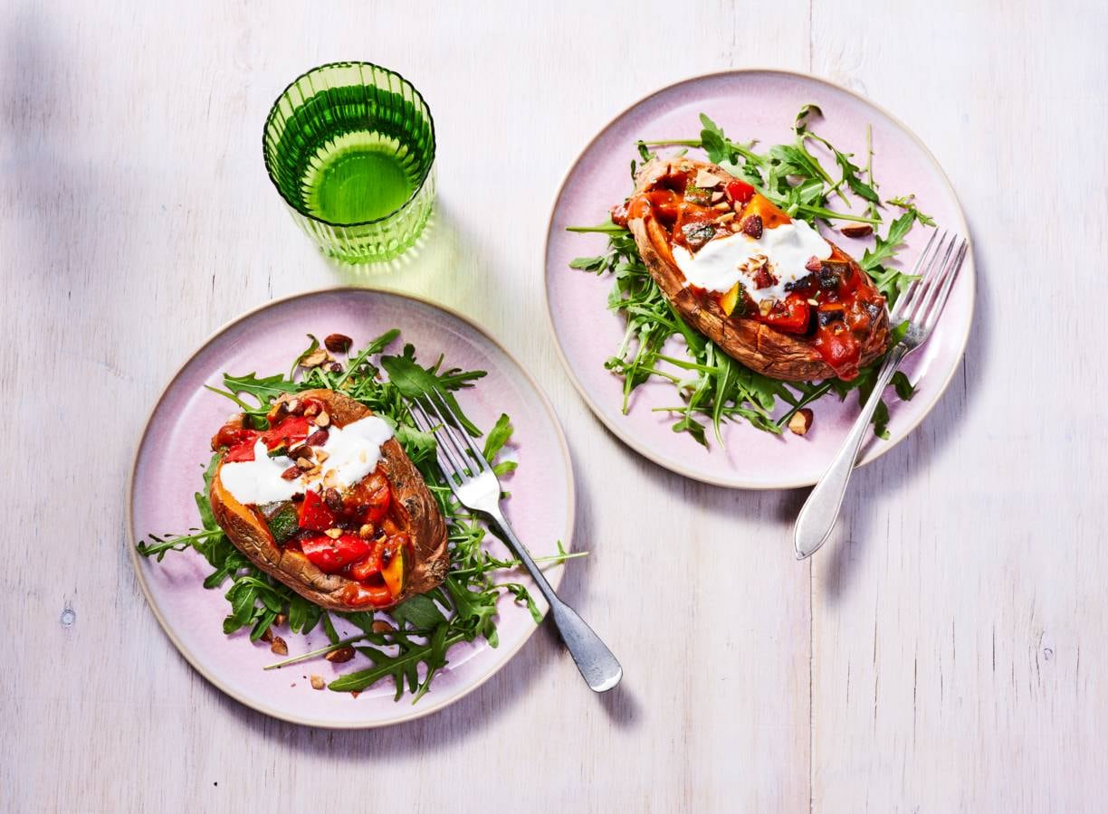 Groenten stoven in een geurige tomatensaus is een garantie voor succes. Gebruik je dit als vulling voor een gepofte zoete aardappel, dan weet je: die borden gaan schoon leeg!