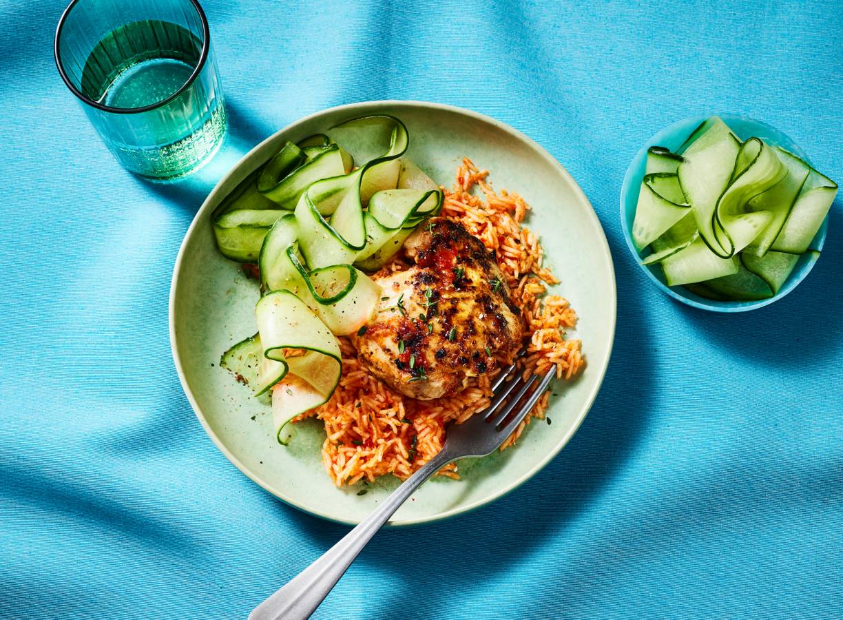 bereidingstip:Marineer de kip 1 nacht in de saus. Maak de komkommersalade 1 dag van tevoren. Bewaar beide afgedekt in de koelkast tot gebruik.