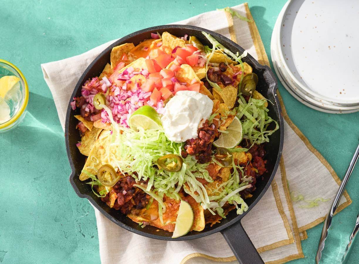 Pers ondertussen de limoen uit en meng door de rest van de ui. Snijd de tomaten in blokjes van 1 cm en de ijsbergsla in flinterdunne reepjes. Schep de helft van de bonensaus uit de pan en hou achter. Verdeel in twee lagen de nacho’s en kaas over de saus in de pan, eindig met de kaas. Laat smelten op de barbecue. Verdeel de achtergehouden saus, de sla, tomaten, rest van de ui, zure room en jalapeño’s erover en serveer direct.