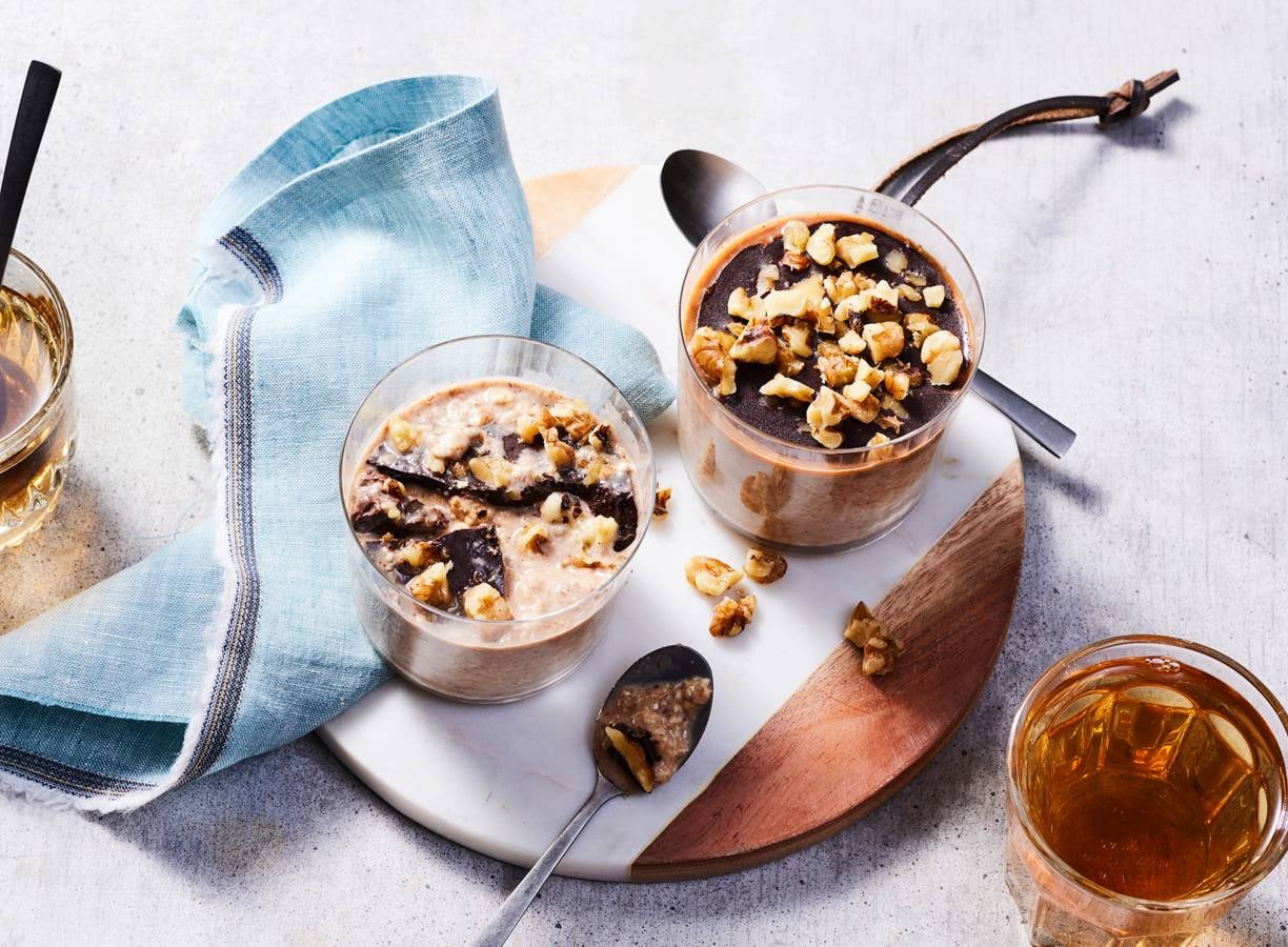 Verdeel de gesmolten chocolade gelijkmatig over de overnight oats. Zorg ervoor dat het helemaal bedekt is. Bestrooi de chocolade met de rest van de walnoten. Dek af met vershoudfolie en zet een nachtje in de koelkast.