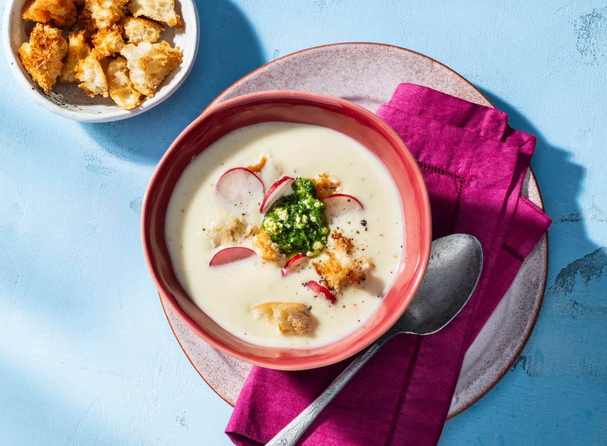 Hugo gaat voor deze soep aan de slag met radijsjes. De radijsjes gaan de soep in en een deel van het groen wordt gebruikt voor een pesto. Samen met zelfgemaakte knoflook croutons wordt je soep een kleurig kommetje.