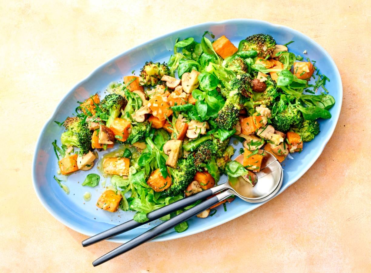 Salade van geroosterde zoete aardappel, broccoli en champignons