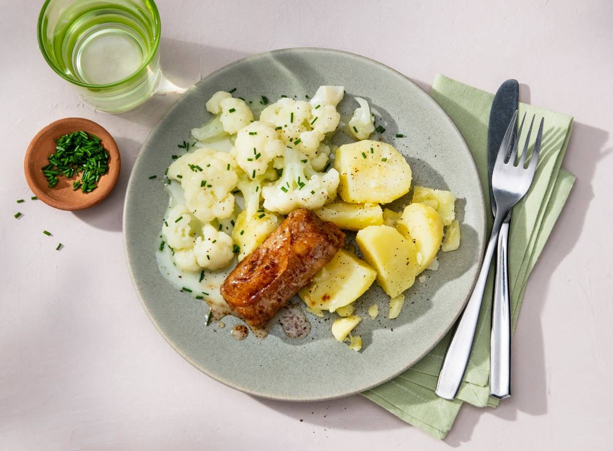 Maak de kaassaus volgens de aanwijzingen op de verpakking. Verdeel de aardappelen, slavinken en bloemkool over borden. Verdeel de kaassaus over de bloemkool.