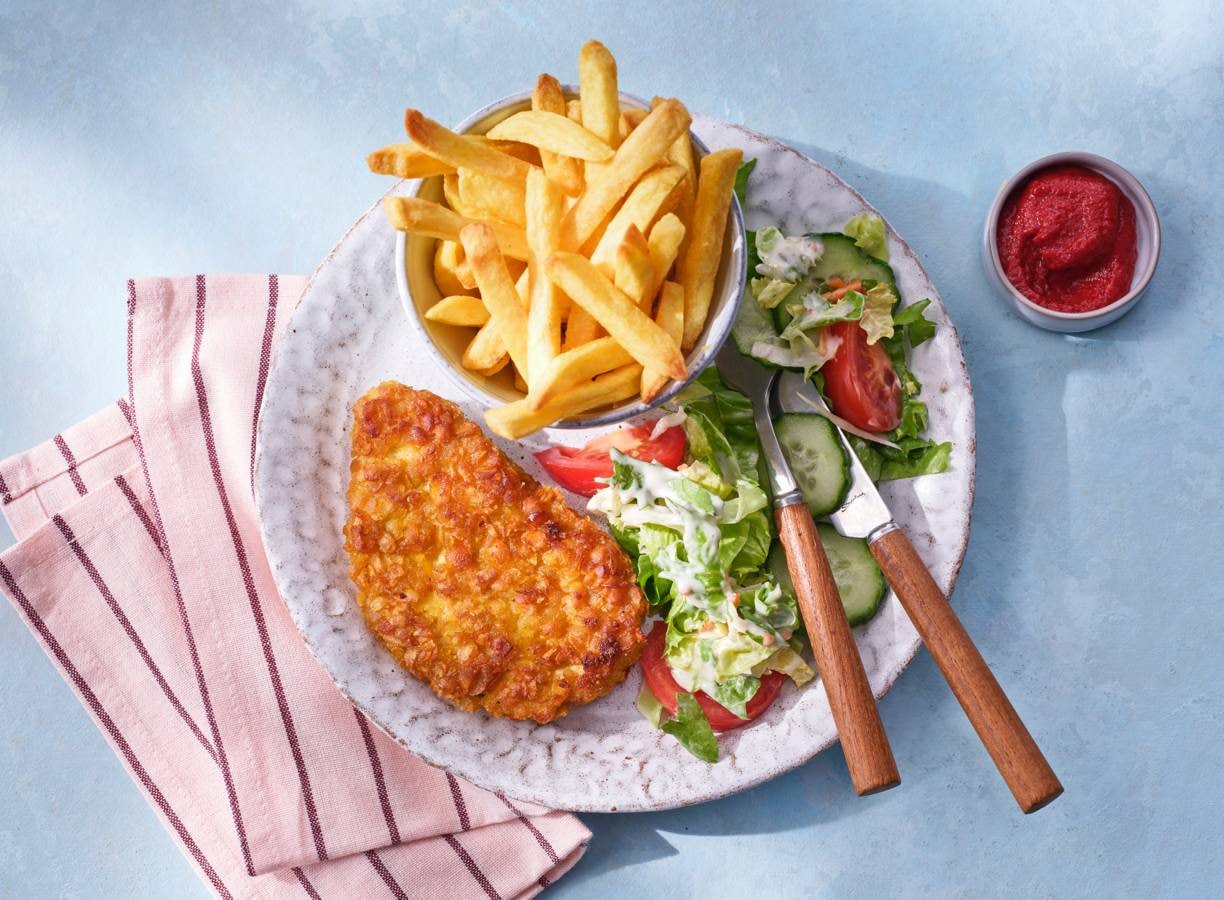 Zin in een schnitzel? Begrijpelijk! Serveer 'm met ovenfriet. In de tijd dat die in de oven zitten bak je niet alleen je schnitzel, maar kun je ook een salade voorbereiden. Zo is alles tegelijk klaar en zit je in 20 minuten al aan tafel.