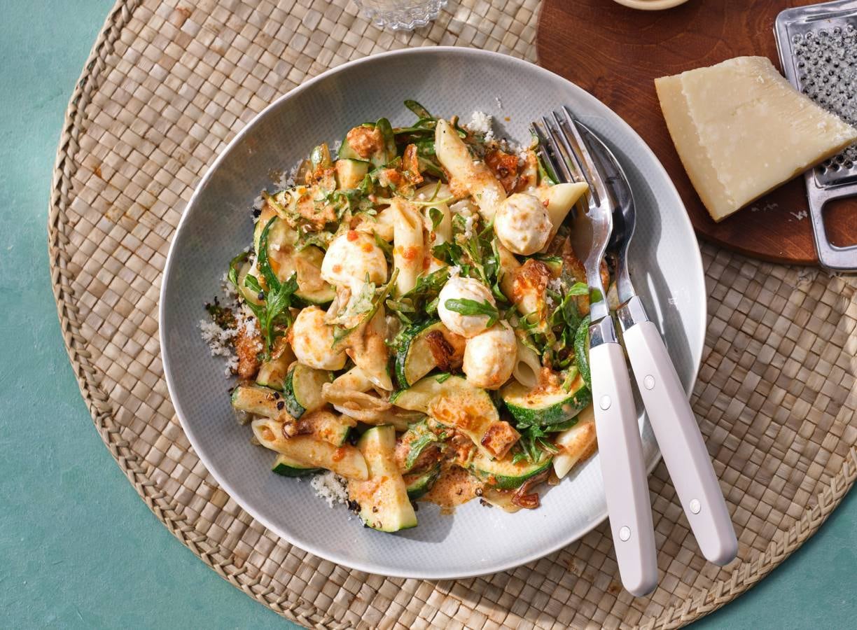 Meng de pasta met de pesto, crème fraîche, 100 ml kookvocht (per 4 personen), gebakken groenten, mozzarella en rucola en breng op smaak met peper en eventueel zout.