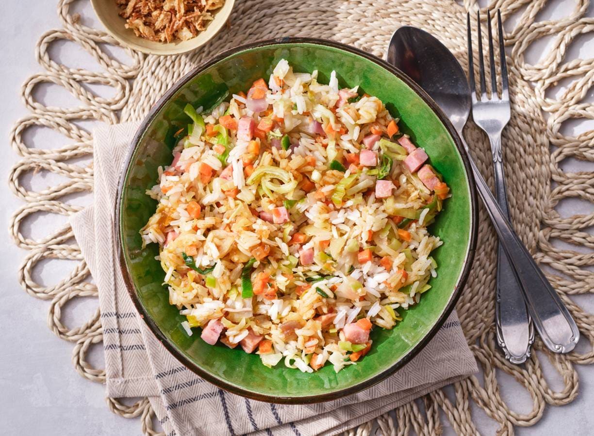 Voluit is het eigenlijk 'nasi goreng' maar ondertussen snappen we allemaal wat er met nasi bedoeld wordt: gebakken rijst! Deze Nederlandse versie maken we met ham, voorgesneden groente en een handig bakje boemboe. Dat scheelt tijd.