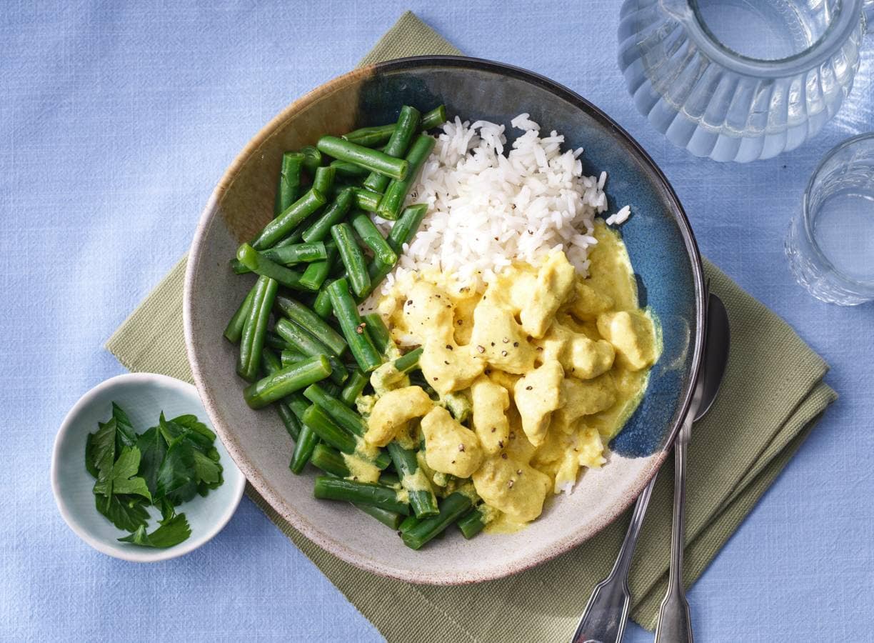 Kook ondertussen de sperziebonen in 8 min. beetgaar en giet af. Serveer de rijst met de kip kerrie en sperziebonen.