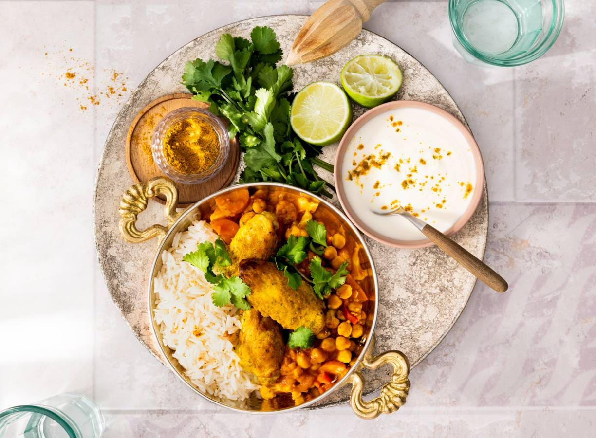 Serveer de curry met de rijst, geroosterde kip, koriander, resterende yoghurt en een limoenpartje.