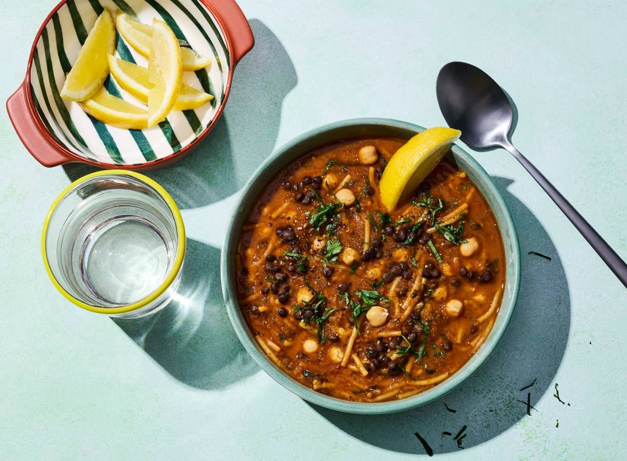 Voeg de linzen, vermicelli en kikkererwten toe aan de soeppan en kook nog 10 min. mee. Breng de soep op smaak met peper en eventueel zout. Bestrooi voor het serveren met de achtergehouden verse kruiden en serveer de soep met de partjes citroen.